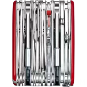 Bolígrafo de presión / Destapador / Punzón escariador / Hoja para electricista / Destornillador Phillips 1/2 / Palillo de dientes / Pinzas / Tijeras / Abrelatas / Hoja pequeña / Alfiler / Lupa / Gancho multiuso / Quita escamas / Alicate multiuso de punta fina / Sierra para madera / Espátula farmacéutica / Anilla / Lima de uñas / Caja de puntas / Hoja para relojero / Hoja grande con filo dentado / Destornillador 2.5 mm / Formón y raspador 4 mm / Llave de tuercas / Llave fija universal M3, M4, M5 / Hoja de injerto / Punzón, escariador y aguja de coser / Hoja grande / Mini-destornillador de 1.5 mm / Sacacorchos